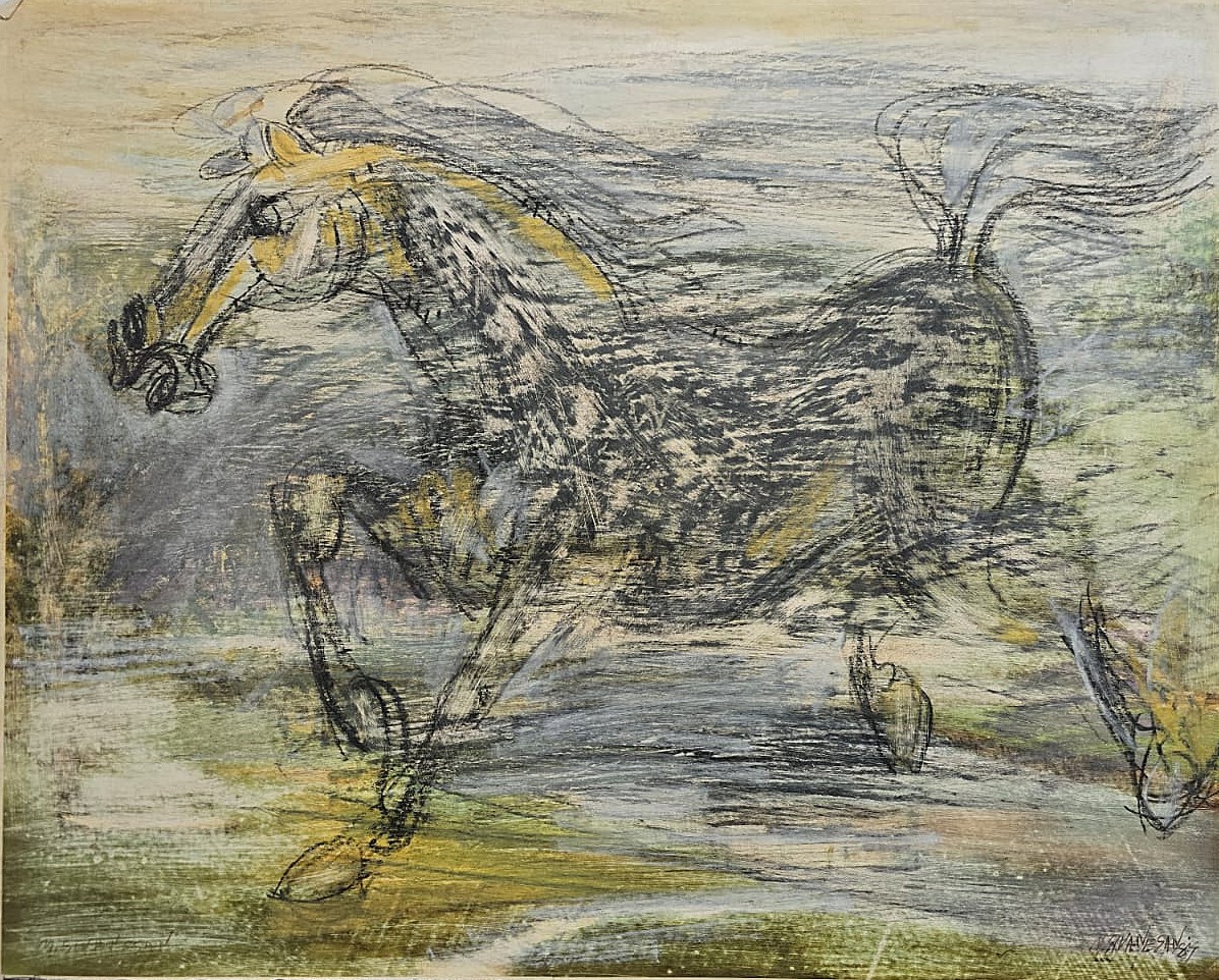 Description: In this energetic untitled work, M Sivanesan captures the raw vitality of a galloping horse through expressive strokes and a dynamic palette of earthy tones. The lines blur in motion, giving the piece a sense of untamed spirit and freedom. The horse, a timeless symbol of strength and grace, seems to leap through space and time, embodying both power and the fleeting nature of momentum and life.