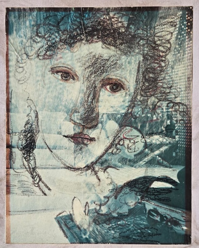 Description: This enigmatic piece by M Sivanesan presents a dreamlike female visage layered over a fragmented background, blending drawing with printed imagery. The expressive face, sketched with emotional intensity, seems to emerge from and dissolve into the surface. With subtle textures and surreal juxtapositions, the work explores themes of feminine identity, introspection, and the coexistence of inner emotion with external reality. A quiet yet powerful meditation on presence and perception.