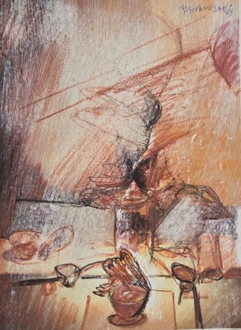 Description: In this warm-toned composition, M Sivanesan conjures a still life scene that hums with latent energy. Everyday objects—cups, vessels, books—are sketched with sweeping, animated lines that breathe life into the domestic setting. The layered, dynamic strokes and glowing palette suggest movement, memory, and fleeting moments suspended in time. It’s a poetic reflection on the quiet rituals of daily life, charged with introspection and gentle intensity.