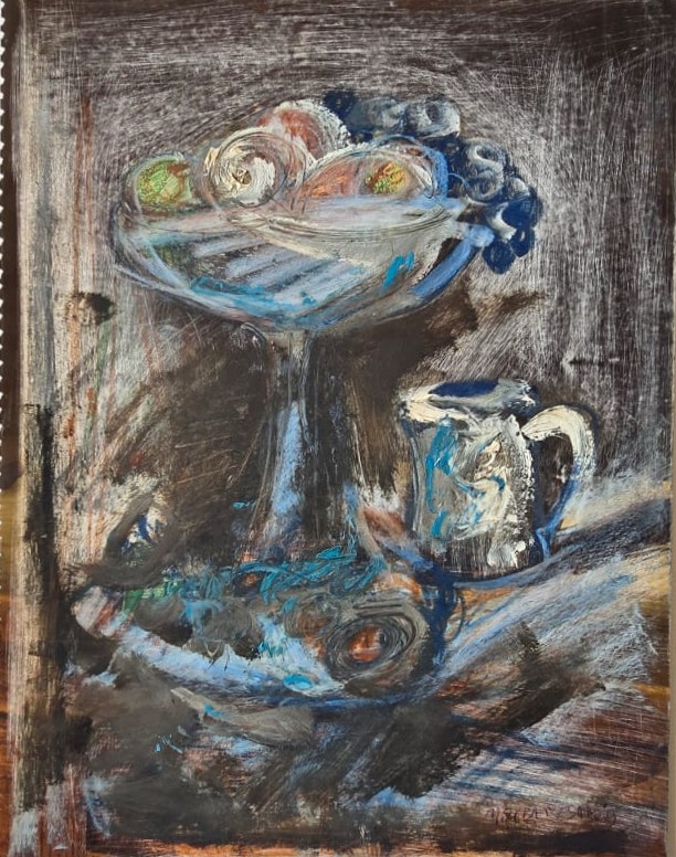 Description: In this expressive still life, M. Sivanesan transforms everyday objects into emotive forms through bold, swirling strokes and deep, moody tones. A fruit bowl and pitcher emerge from the textured darkness with an almost luminous quality. The painterly movement and layered surface evoke a sense of quiet drama, infusing the domestic scene with symbolic weight—perhaps reflecting abundance, fragility, or the fleeting nature of life’s simple moments.